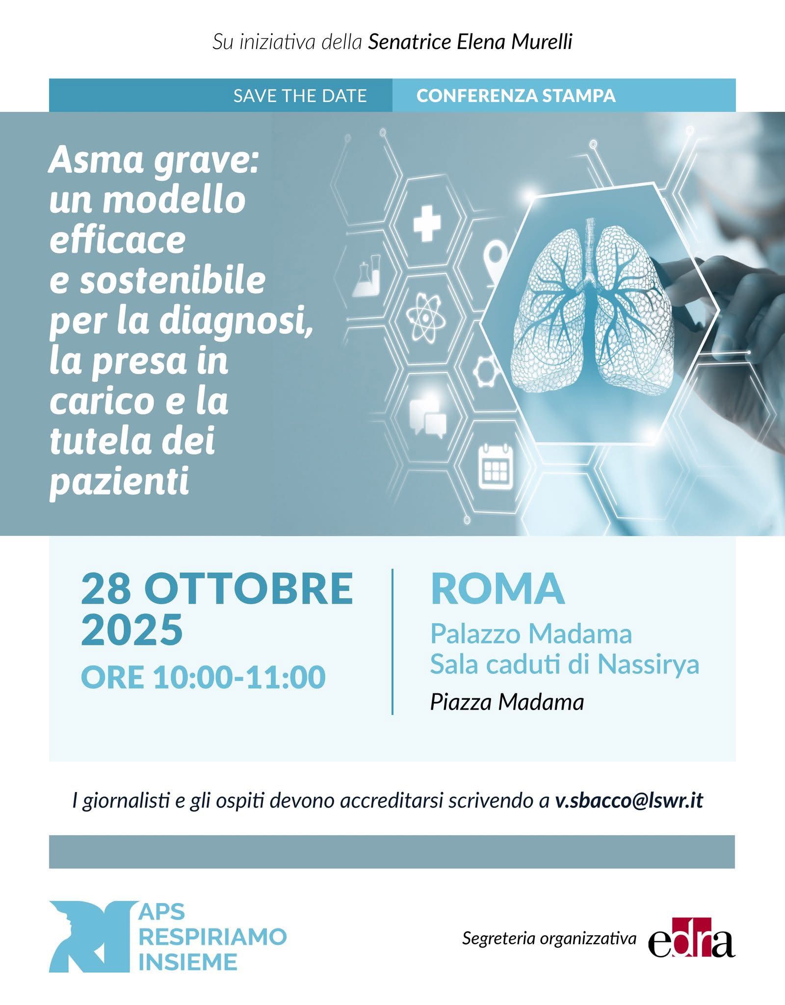 Martedì 28 ottobre 2025, dalle 10:00 alle 11:00, a Roma presso Palazzo Madama – Sala Caduti di Nassirya (Piazza Madama), si terrà la conferenza stampa “Asma grave: un modello efficace e sostenibile per la diagnosi, la presa in carico e la tutela dei pazienti”, su iniziativa della Senatrice Elena Murelli, in collaborazione con Respiriamo Insieme APS e con il supporto organizzativo di Edra S.p.A.