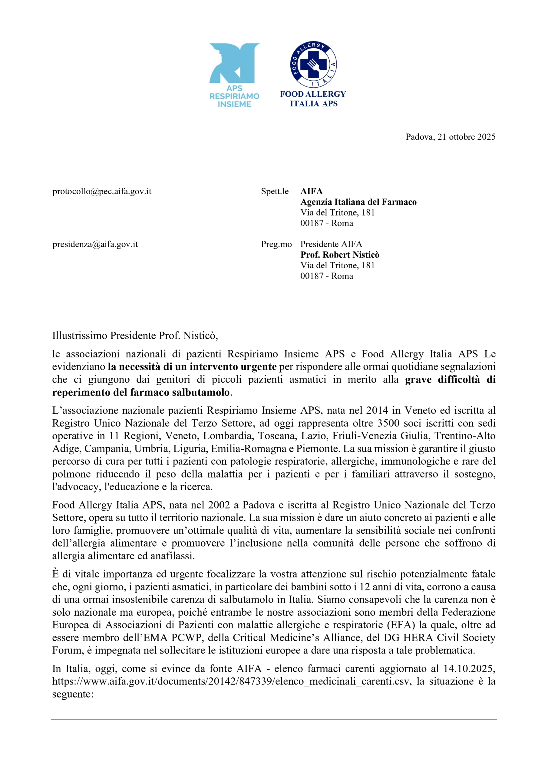 Nelle lettere inviate a Ministero della Salute e AIFA, Respiriamo Insieme APS e Food Allergy Italia APS hanno chiesto:
