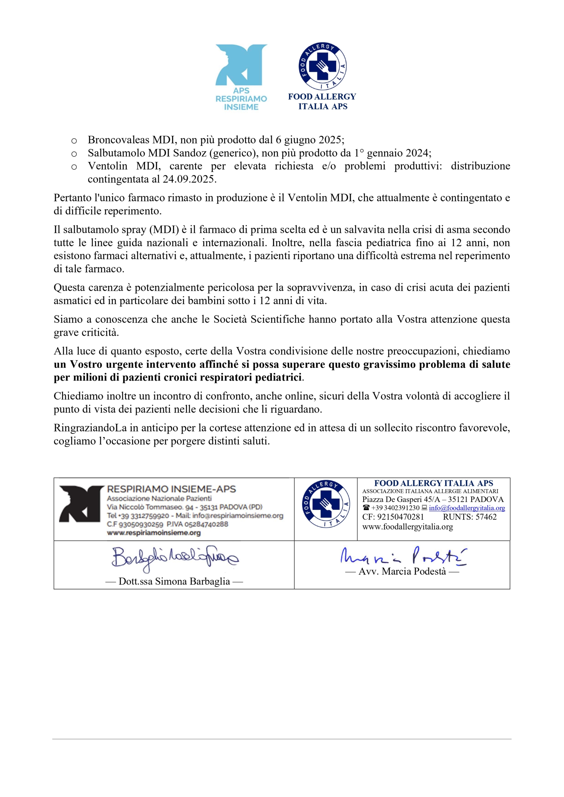 Le lettere integrali sono state inviate in data 21 ottobre 2025 al Ministero della Salute e all’Agenzia Italiana del Farmaco (AIFA).