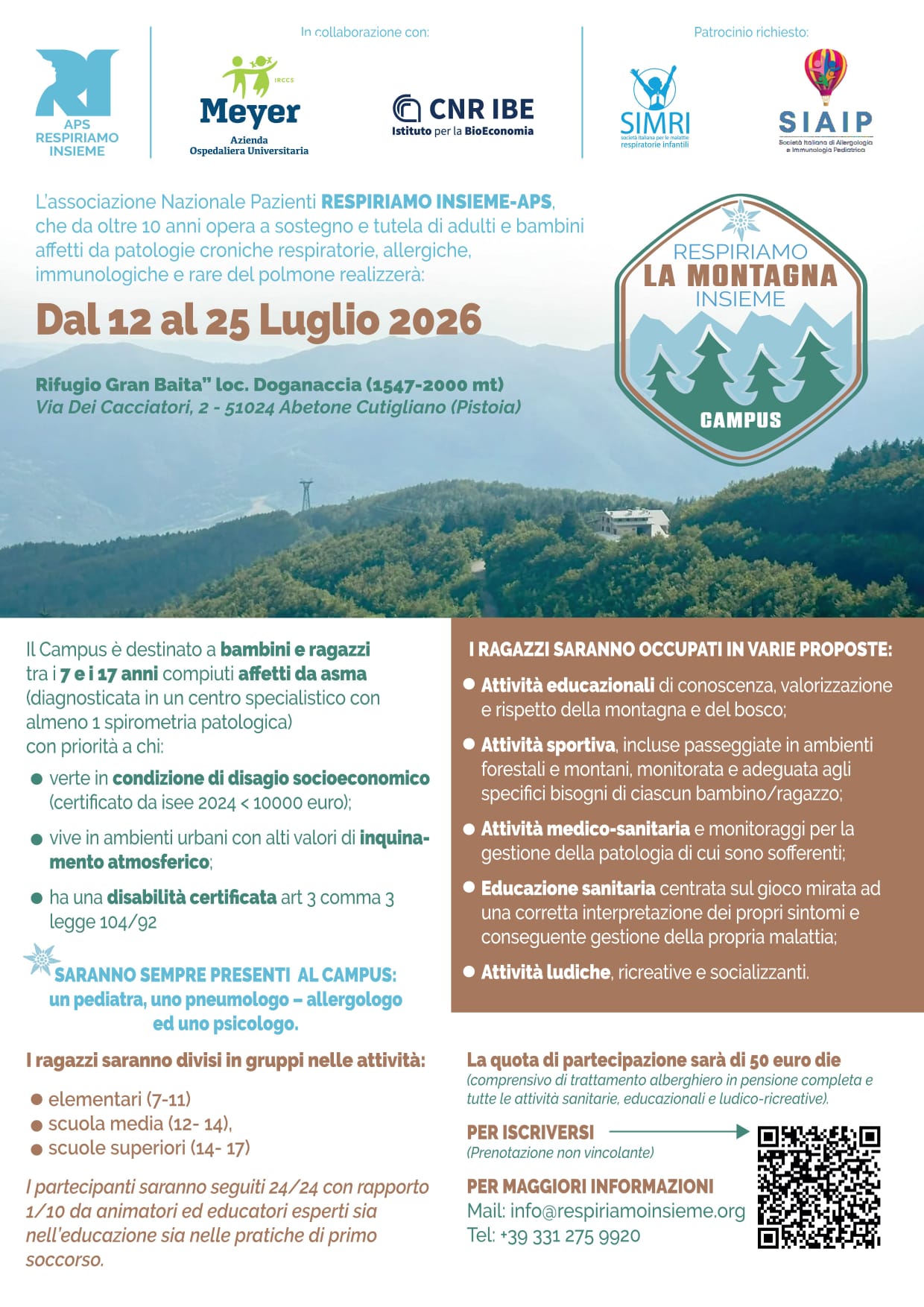 Dopo lo straordinario successo della prima edizione, torna anche per il 2026 “Respiriamo la Montagna Insieme – Campus”, il progetto promosso da Respiriamo Insieme APS dedicato a bambini e ragazzi con asma.